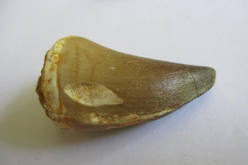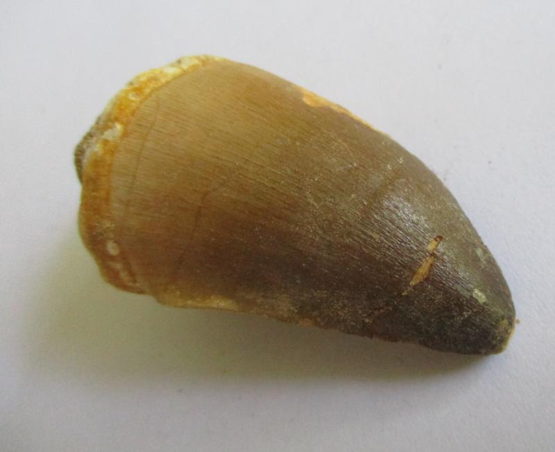 De grootte van deze fossiele mosasaurus tand is 4 cm. Het fossiel is gevonden in een fosfaat mijn in Marokko en komt uit het Boven Krijt (Maastrichtian, 72 – 66 miljoen jaar geleden).