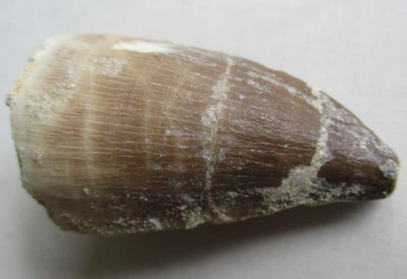 De grootte van deze fossiele mosasaurus tand is 4 cm.