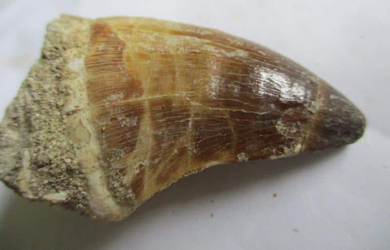 De grootte van deze fossiele mosasaurus tand is 4.5 cm. Het fossiel is gevonden in een fosfaatmijn in Marokko en stamt uit het Boven-Krijt (Maastrichtien, 72–66 miljoen jaar geleden).
