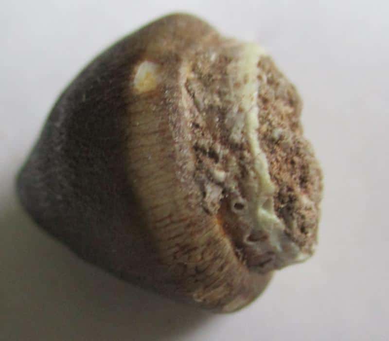De grootte van deze fossiele mosasaurus tand is 2.5 cm.