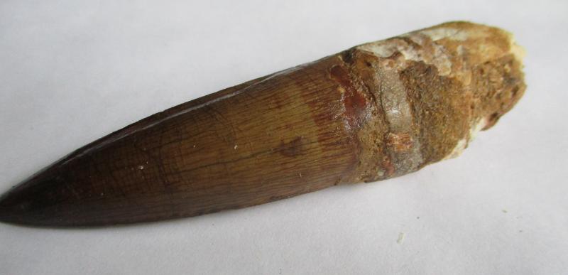 De grootte van deze Spinosaurus tand is 9.0 cm. Het fossiel is gevonden in Marokko en komt uit het Krijt (112 – 93.5 miljoen jaar oud).