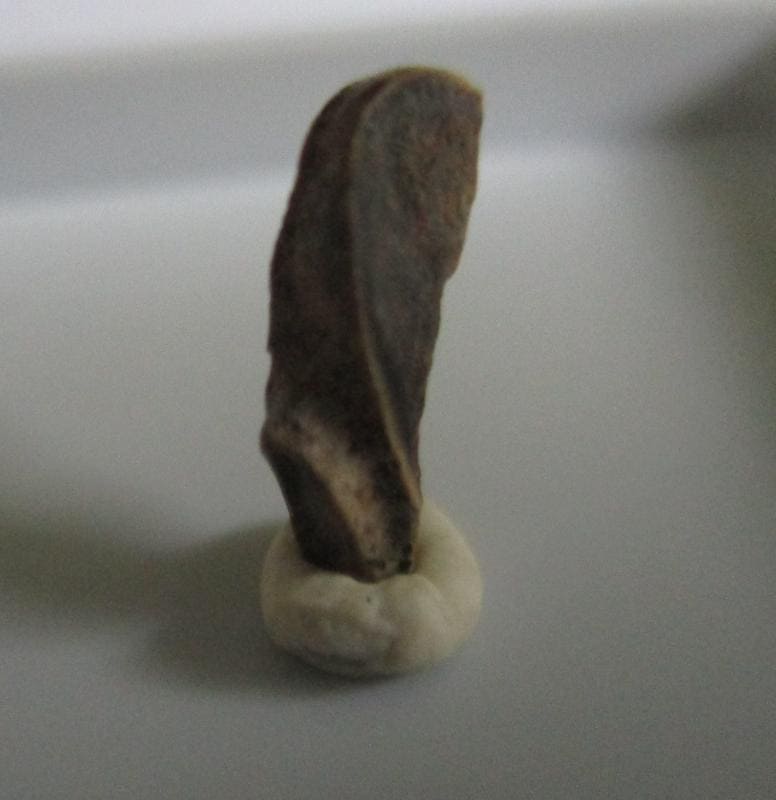 De grootte van deze Triceratops tand is 1 cm. Het fossiel is gevonden in de VS en komt uit het Laat Krijt (68 – 66 miljoen jaar oud).