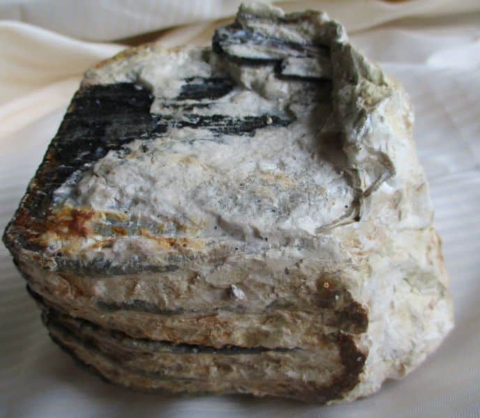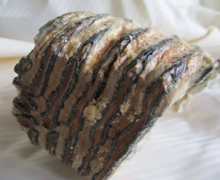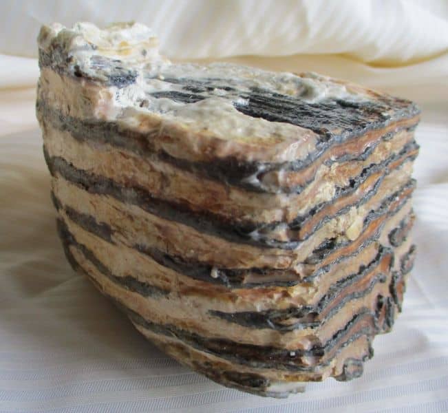 De grootte van deze mammoet tand fragment is 12 bij 6 bij 6 cm.