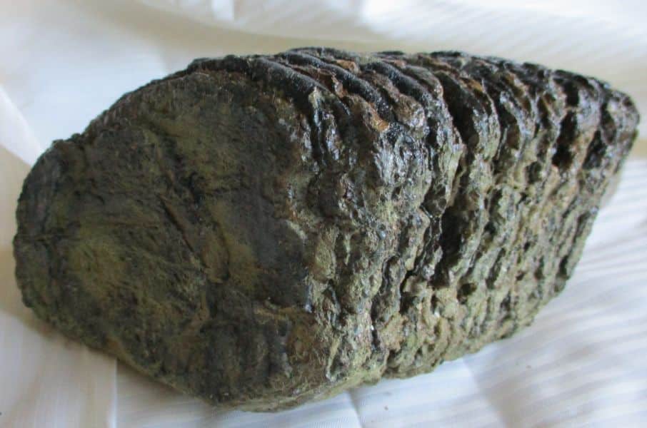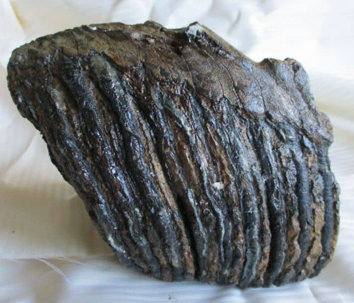 De grootte van deze mammoet tand fragment is 15 bij 14 bij 9 cm.