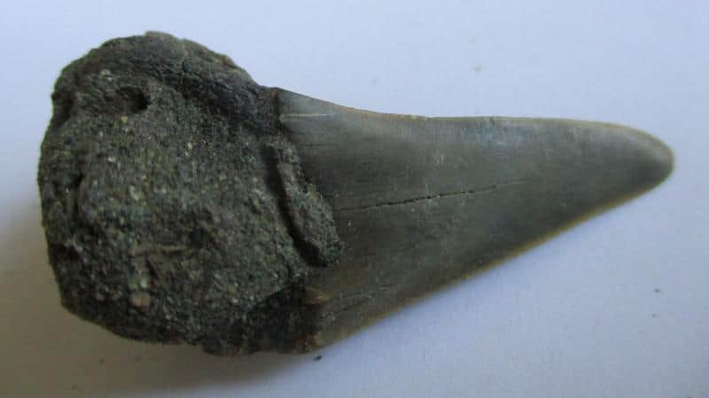 De grootte van deze fossiele haaientand (exclusief steen) is 3 cm. Inclusief steen, de grootte is 3 bij 4 cm. Het fossiel is gevonden in Antwerpen, België.
