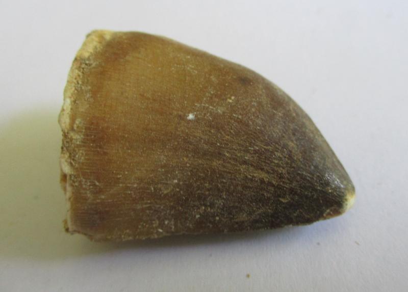 The size of this fossil mosasaurus tooth is 3.5 cm. The fossil has been found in a phosphate mine in Morocco and is from the Upper Cretaceous (Maastrichtian, 72 – 66 million years ago).