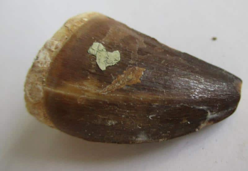 The size of this fossil mosasaurus tooth is 3.0 cm. The fossil has been found in a phosphate mine in Morocco and is from the Upper Cretaceous (Maastrichtian, 72 – 66 million years ago).