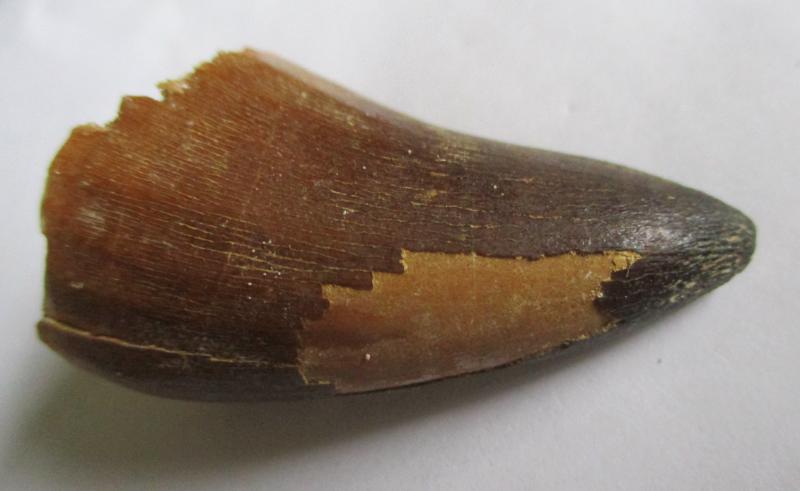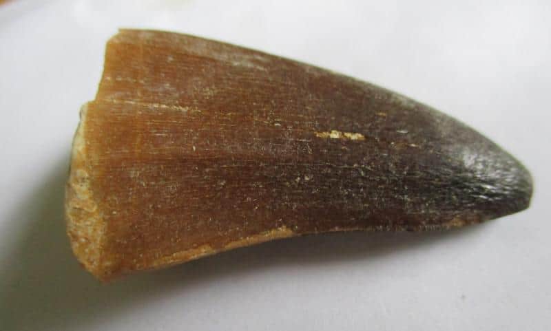 The size of this fossil mosasaur tooth is 4.0 cm. The fossil was found in a phosphate mine in Morocco and dates to the Upper Cretaceous (Maastrichtian, 72–66 million years ago).