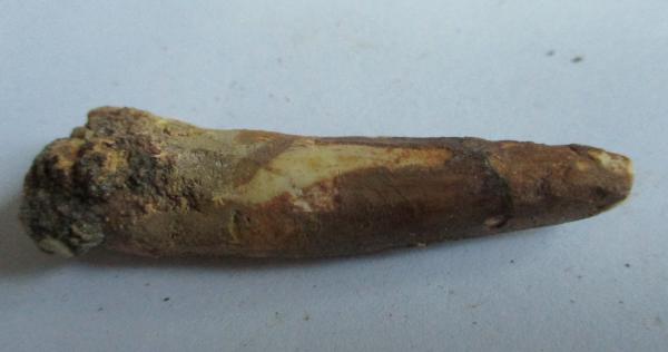 The size of this Spinosaurus tooth is 5.0 cm. The fossil has been found in Morocco and is from the Cretaceous (112 – 93.5 million years old).