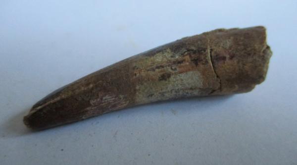 The size of this spinosaurus tooth is 6.0 cm. The fossil has been found in Morocco and is from the Cretaceous (112 – 93.5 million years old).
