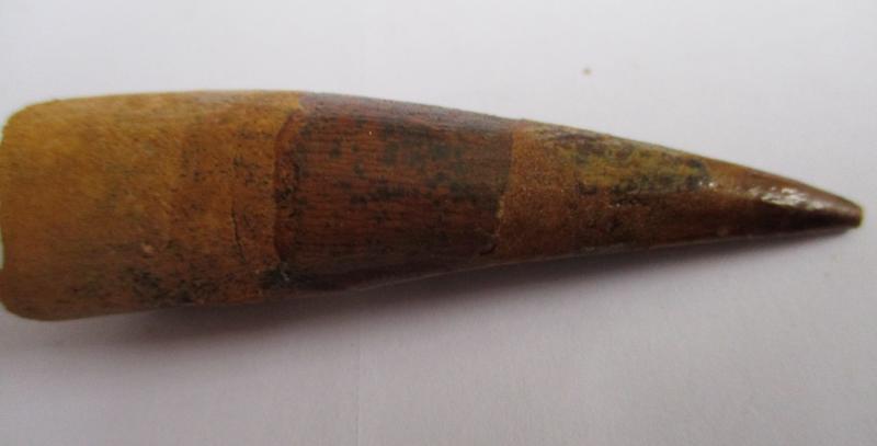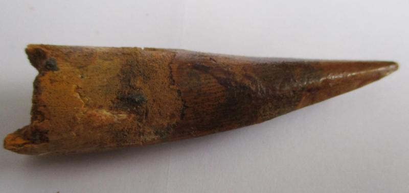 The size of this Spinosaurus tooth is 6.0 cm. The fossil was found in the Kem Kem Hamada, Morocco, and dates to the Cretaceous period (145–66 million years ago).