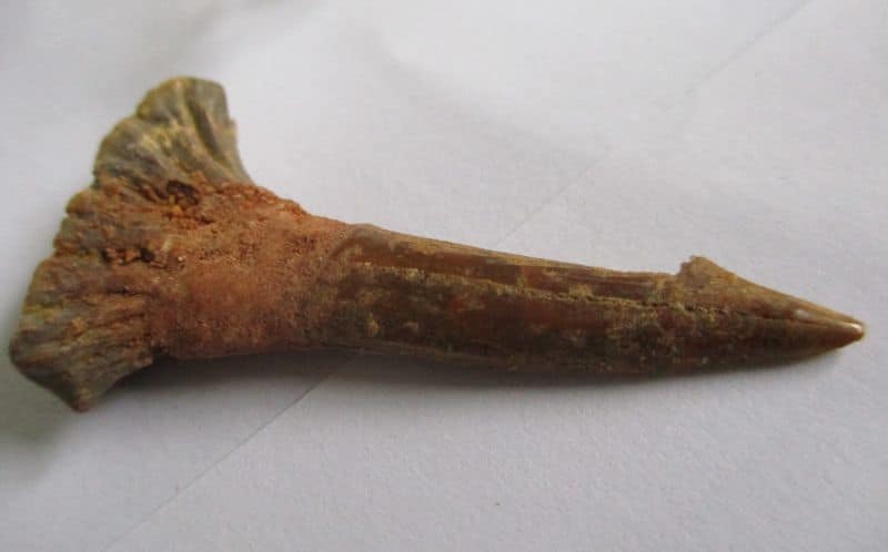The size of this fossil sawfish tooth (Onchopristis) is 4.0 cm. The fossil has been found in Morocco and is from the Cretaceous (130 – 93 million years old).