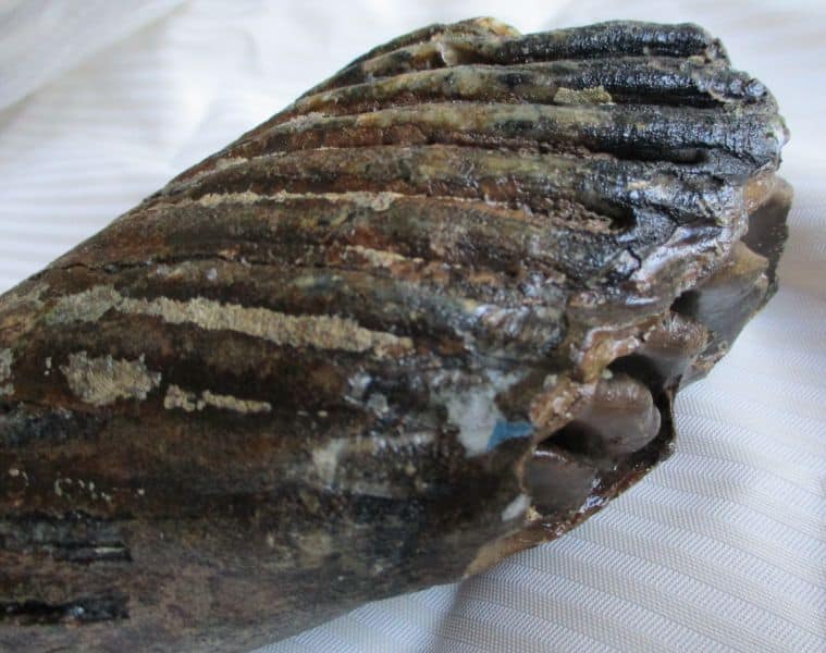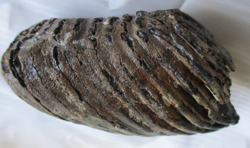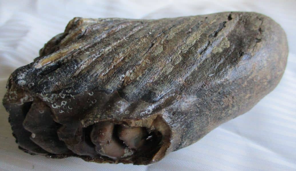 The size of this mammoth molar (fragment) is 13 by 9 by 5 cm.