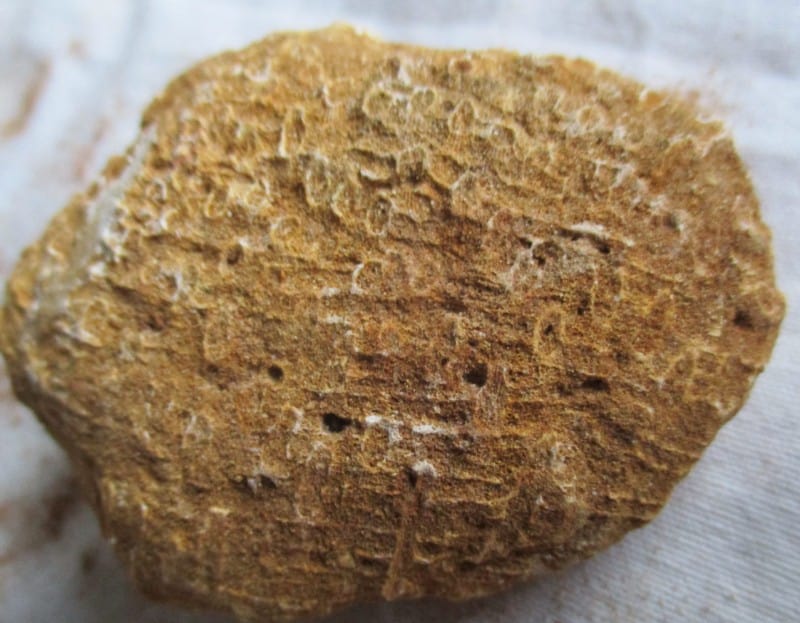 The size of this coral is 8.0 by 6.0 by 3.0 cm. The fossil has been found in France (Peoua, Gironde) and is from the Burdigalian (Miocene, 20.43 – 15.97 million years old).